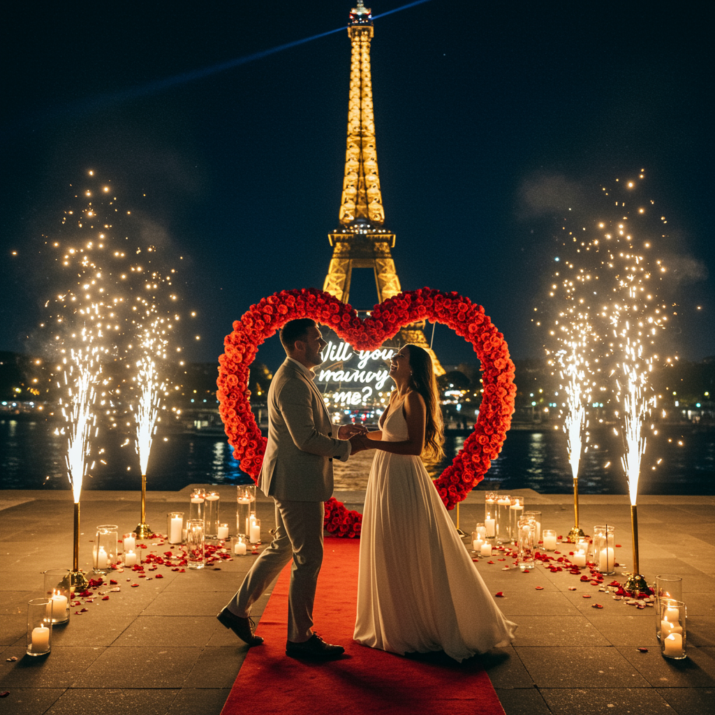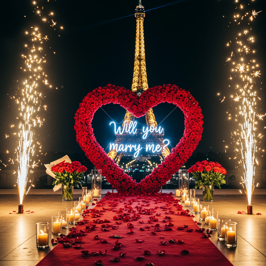Offrez-vous un moment d'exception avec notre Pack Prestige, une expérience inoubliable où l'émotion rencontre l’élégance. Ce pack comprend un cœur géant de 2 mètres de hauteur, magnifiquement décoré de roses rouges sur toute sa surface, accompagné d’un néon lumineux « WILL YOU MARRY ME ? » pour un effet visuel saisissant. Le tapis rouge, les bougies créant une ambiance romantique, et les roses assorties à la décoration ajouteront une touche de raffinement à votre demande. Deux jets de scène de 3m de hauteur apporteront un effet spectaculaire, tandis que l’ambiance musicale personnalisée et l’installation soignée vous offriront une expérience sans pareil. Chaque détail est pensé pour rendre cette demande en mariage inoubliable.